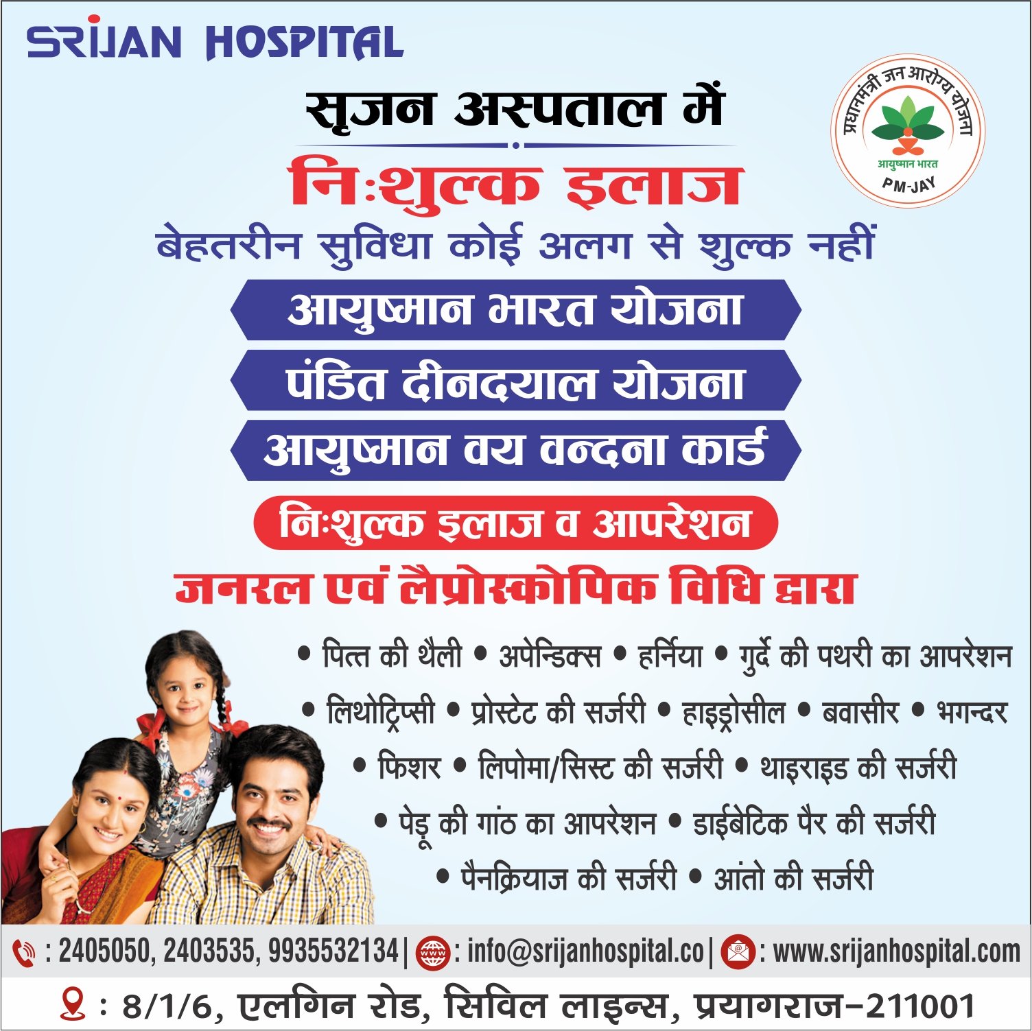 Srijan Hospital is a CGHS approved and NABH Accredited multi-speciality hospital established in 2005 to provide high-quality healthcare in the pious city of Prayagraj and its surrounding areas. A multi-specialty hospital, Srijan is well-developed with departments for super specialties like IVF (Test Tube Centre), Intensive Care, Laparoscopic Surgery, Neonatology, Paediatric Surgery, Interventional Pain Clinic...